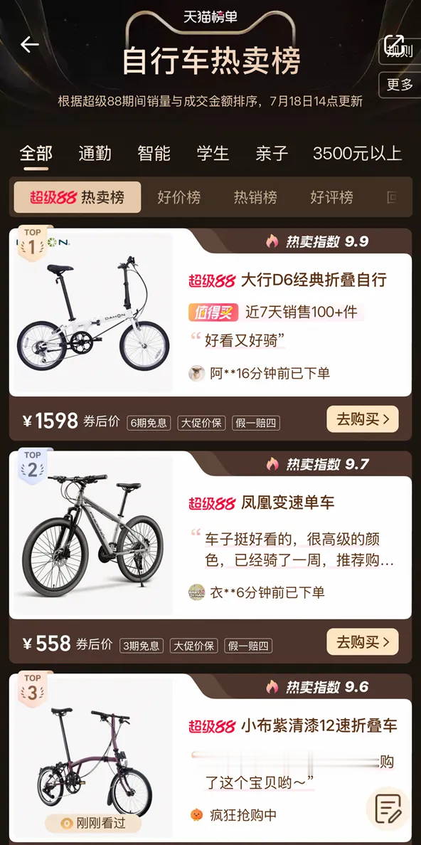 在淘宝平台上,这款自行车 18 日已跻身自行车热卖榜前三,超千人加入购物车,其中 “流光紫清漆” 色成为最受欢迎的款式。