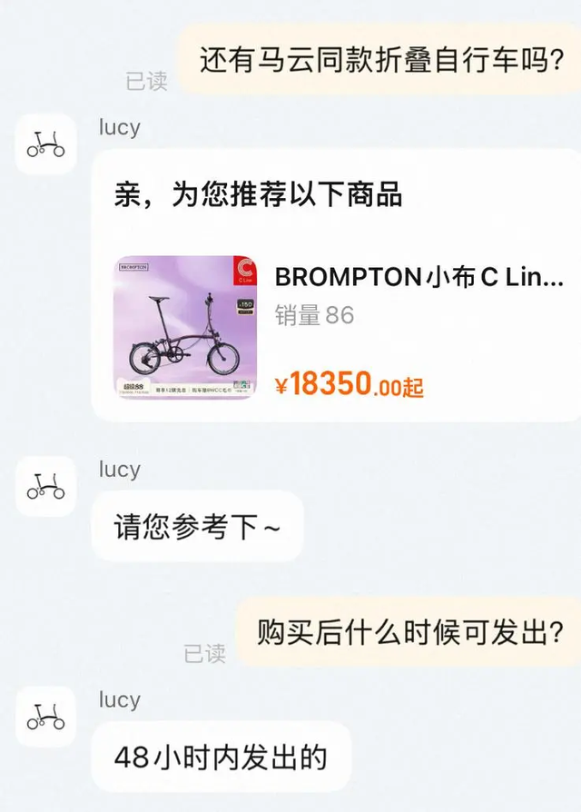 小玺君还从 BROMPTON 淘宝官方旗舰店客服处了解到,目前马云同款折叠自行车尚有库存在售,每人限购 2 辆,付款后 48 小时内即可发货。